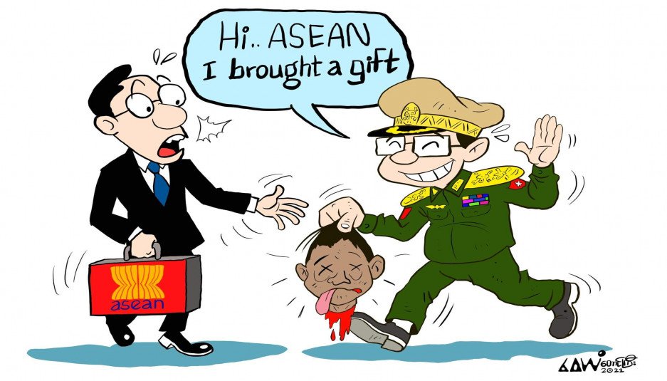 ဒီနေရာမှာအာဆီယံရဲ့အခန်းကဏ္ဍကလည်း အရေးပါတာတွေ့ရပါတယ်။ အင်အားကြီးနိုင်ငံတွေ ထိပ်တိုက်တွေမှာကို ရှောင်ရှားတဲ့အနေနဲ့ ကုလသမဂ္ဂရော၊ အမေရိကနဲ့ တရုတ်ကပါ၊ မြန်မာ့အရေးကို အာဆီယံအဖွဲ့က ဦးဆောင်ဖြေရှင်းတာကို လိုလားပါတယ်။ သူတို့ခေါင်းပေါ်က အထုတ်ရှုပ်ကို အာဆီယံအပေါ်ပြောင်းတင်ပေးလိုက်တဲ့သဘောပါပဲ။ ဒါပေမဲ့ အာဆီယံအဖွဲ့အနေနဲ့ ညီညွတ်မှုအားနည်းတဲ့အပြင် ကုလသမဂ္ဂလုံခြုံရေးကောင်စီလိုမျိုး၊ နေတိုးအဖွဲ့လိုမျိုး အားကောင်း တဲ့စစ်တပ်တွေကို သုံးနိုင်တဲ့ အခြေအနေမရှိပါဘူး။ အာဆီယံမှာကိုယ်ပိုင်စစ်တပ်မရှိတဲ့အတွက် ၊ စစ်ရေးတင်းမာနေတဲ့ မြန်မာနိုင်ငံအရေးဖြေရှင်းဖို့ အရာမှာ လေပြောသာဖြစ်နေပါလိမ့်မယ်။ ဒါကြောင့် အာဆီယံရဲ့ ဘုံသဘောတူညီချက် ၅ ချက်ကို မြန်မာစစ်ကောင်စီက၏ မထီမဲ့မြင်ပြုနေတာပါ။ အာဏာသိမ်းတာ ၇ လကြာတဲ့အထိ ဘုံသဘောတူညီချက်တွေထဲက အာဆီယံအထူးသံတမန်ခန့်အပ်တဲ့၊ ၁ ချက်ပဲ အကောင်အထည်ဖေါ်နိုင်ပါသေးတယ်။ ကျန်တာတွေ အကောင်အထည်ဖေါ်ဖို့က စစ်ကောင်စီသဘောမတူရင်မရတဲ့ အခြေအနေမှာရှိပါတယ်။ အင်ဒိုနီးရှားနိုင်ငံရဲ့ နိုင်ငံခြားရေးဝန်ကြီးဌာနပြောရေးဆိုခွင့်ရှိသူကတော့ “ မြန်မာပြည်သူတွေရဲ့ လုံခြုံမှုနဲ့ကောင်းစွာနေထိုင်နိုင်မှုတွေကို နှစ်ဘက်စလုံးက ဦးစားပေးအနေနဲ့ဆောင်ရွက်သင့်တယ်” လို့ ယေဘုယျဆန်ဆန်ပြောထားပေမဲ့ နှစ်ဘက်စလုံးကတော့ စစ်ပွဲအတွက်ပြင်ဆင်နေကြပါပြီ။ တရုတ်နဲ့ အမေရိကန်၊ အီးယူတို့က အကြမ်းဖက်စစ်ပွဲတွေကို ရှောင်ရှားဖို့ အလေးပေးတိုက်တွန်းနေကြပြီး အာဆီယံကလည်း ငြိမ်းချမ်းရေးကို ဦးစားပေးစေလိုကြောင်း တဖွဖွပြောနေပေမဲ့ စင်္ကာပူ၊ အင်ဒိုနီးရှားနဲ့ ဖိလစ်ပိုင်နိုင်ငံတွေက မြန်မာစစ်တပ်ကို လက်နက်ရောင်းချနေတဲ့ နိုင်ငံတွေပါ။