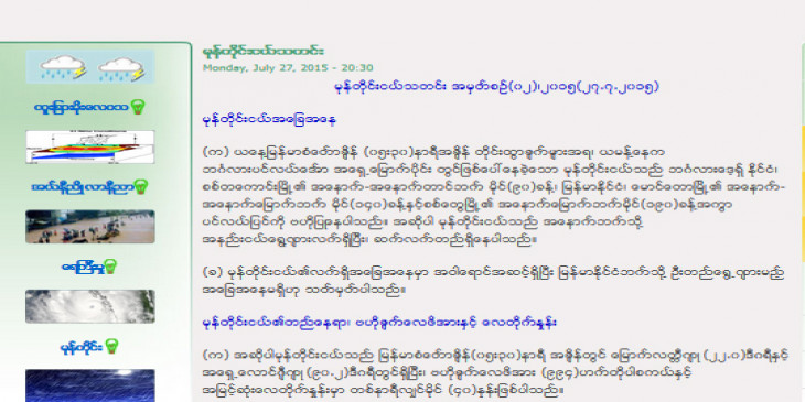 ဒီကေန႔ ဇူလိုင္ ၂၇ ရက္ မိုးဇလဌာနရဲ႕ ခန္႔မွန္းထုတ္ျပန္ခ်က္မွာ “ယမန္ေန႔က ဘဂၤလားပင္လယ္ေအာ္ အေရွ႕ေျမာက္ပိုင္းတြင္ ျဖစ္ေပၚေနခဲ့ေသာ မုန္တိုင္းငယ္သည္ ဘဂၤလားေဒ့ရွ္ႏိုင္ငံ၊ စစ္တေကာင္းၿမိဳ႕၏ အေနာက္-အေနာက္တာင္ဘက္ မိုင္(၉၀)ခန္႔၊ ျမန္မာႏိုင္ငံ၊ ေမာင္ေတာၿမိဳ႕၏ အေနာက္-အေနာက္ေျမာက္ဘက္ မိုင္(၁၄၀)ခန္႔နွင့္စစ္ေတြၿမိဳ႕၏ အေနာက္ေျမာက္ဘက္မိုင္ (၁၉၀) ခန္႔အကြာ ပင္လယ္ျပင္ကို ဗဟိုျပဳေနပါသည္။ အဆိုပါ မုန္တိုင္းငယ္သည္ အေနာက္ဘက္သို႔ အနည္းငယ္ေရြ႕လ်ားလက္ရိွၿပီး၊ ဆက္လက္တည္ရွိေန ပါသည္။ မုန္တိုင္းငယ္၏လက္ရွိအေျခအေနမွာ အဝါေရာင္အဆင့္ရွိၿပီး ျမန္မာႏိုင္ငံဘက္သို႔ ဦးတည္ေ႐ြ႕လ်ားမည့္ အေျခအေနမရွိဟု သတ္မွတ္ပါသည္။” လို႔ ေဖာ္ျပထားပါတယ္။