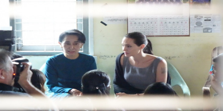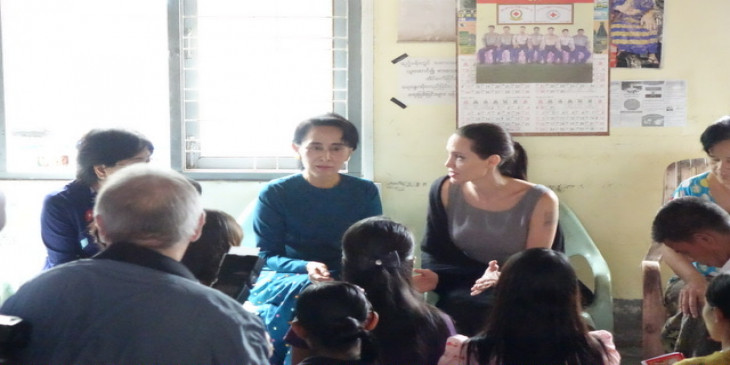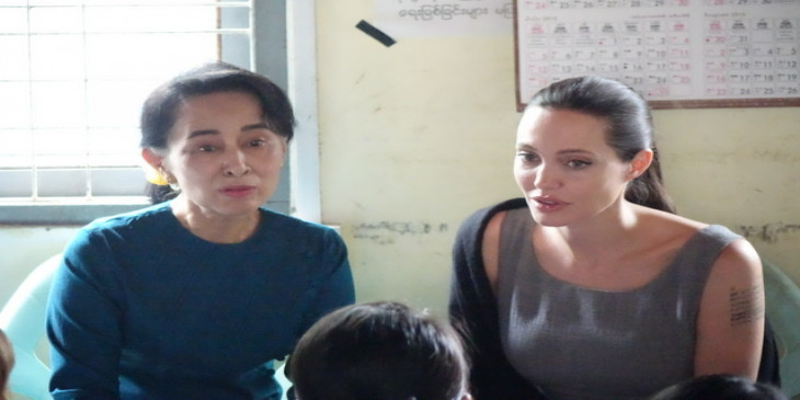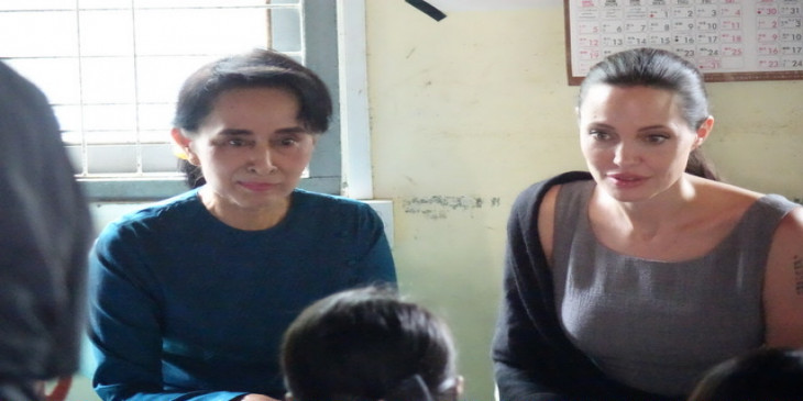 အမ်ိိဳးသားဒီမိုကေရစီအဖြဲ႔ခ်ဳပ္ဥကၠ႒ ေဒၚေအာင္ဆန္းစုၾကည္နဲ႔ ေဟာလီး၀ုဒ္ ႐ုပ္ရွင္မင္းသမီး အိန္ဂ်လီနာ ဂ်ိဳလီ တို႔ႏွစ္ဦး လိႈင္သာယာၿမိဳ႕နယ္ရွိ အလုပ္သမားအမ်ိဳးသမီးငယ္ေတြေနထိုင္တဲ႔ က့ံေကာ္စံ အမ်ိဳးသမီးအေဆာင္ကို ၾသဂုတ္လ ၁ ရက္ေန႔ မနက္ ၉ နာရီေလာက္က သြားေရာက္ျပီး အမ်ိဳးသမီးအလုပ္သမားေတြနဲ႔ ေတြ႔ဆံုေဆြးေႏြးေနစဥ္။