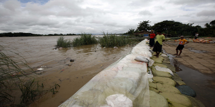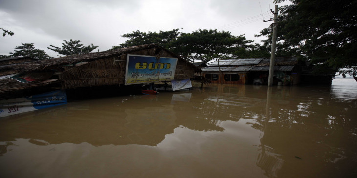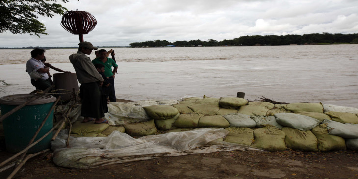 ေညာင္တုုန္းၿမဳိ႕ ေရနစ္ျမဳပ္ေနမႈနဲ႔ ၿမဳိ႕အ၀င္ ဧရာ၀တီ ျမစ္ကမ္းနားမွာ သဲအိတ္ေတြ ခ်ေနမႈ ျမင္ကြင္း။