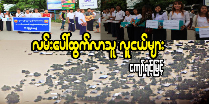 ေရေဘးသင့္ျပည္သူေတြကုိ ကူညီဖုိ႔အတြက္ လူငယ္ေတြ ေက်ာင္းအလုိက္၊ ပရဟိတ အဖဲြ႔အစည္းအလုိက္၊ လုပ္ငန္းဌာနအလုိက္၊ ရပ္ကြက္အလုိက္ နီးစပ္ရာ စုေပါင္းၿပီး လမ္းေပၚမွာ ေရေဘးအလွဴခံၾကတယ္။