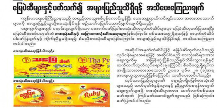 အဲ့ဒီအမွတ္တံဆိပ္နဲ႔ ဆီထုတ္လုပ္ေရာင္းခ်သူေတြအေနနဲ႔ စံမမီတဲ့ဆီေတြကို ေစ်းကြက္အတြင္းကေန အျမန္ဆံုးျပန္လည္႐ုပ္သိမ္းသြားၾကဖို႔နဲ႔ ဆက္လက္ထုတ္လုပ္ေရာင္း ခ်ေနရင္ အမ်ိဳးသားအစားအေသာက္ဥပေဒပုဒ္မ ၂၈(ခ)အရ အေရးယူသြားမယ္လို႔လည္း သတင္းက ဆိုပါတယ္။