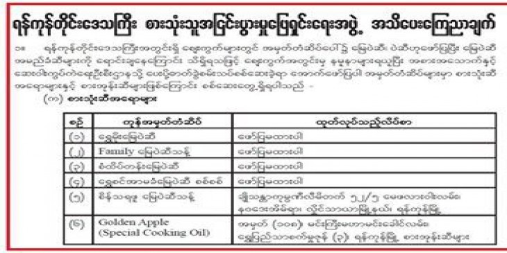 ရန္ကုန္ ေစ်းကြက္အတြင္း ေျမပဲဆီအမည္ခံၿပီး စားအံုးဆီနဲ႔ တျခားစားသံုးဆီေတြ ေရာေႏွာေရာင္းခ်ေနတဲ့ ကုန္ပစၥည္းအမွတ္တံဆိပ္ ၁၀ မ်ဳိးကို ရန္ကုန္တုိင္း ေဒသႀကီး စားသံုးသူ အျငင္းပြားမႈ ေျဖရွင္းေရးအဖြဲ႔က အသိေပးေၾကညာလုိက္ပါတယ္။