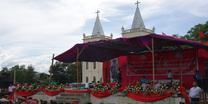 မဲဆြယ္စည္း႐ုံးေရး ခရီးစဥ္အျဖစ္ ကယားျပည္နယ္ကုိ ေရာက္ရွိေနတဲ့ အမ်ုဳိးသားဒီမိုကေရစီအဖြဲ႔ခ်ဳပ္ ဥကၠ႒ ေဒၚေအာင္ဆန္းစုၾကည္ဟာ ဒီေမာဆိုး စိန္႔ဂ်ိဳးဇက္ ဘုရားေက်ာင္းဝင္းမွာ ျပည္သူေတြကုိ ေရြးေကာက္ပြဲေအာင္ႏုိင္ေရးအတြက္ ေဟာေျပာခဲ့ပါတယ္။