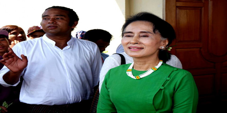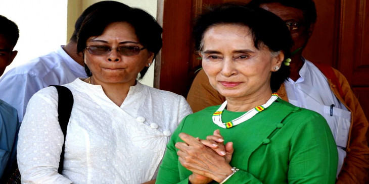 အမ်ဳိးသားဒီမုိကေရစီအဖြဲ႔ခ်ဳပ္ ေဒၚေအာင္ဆန္းစုၾကည္ ဟုမၼလင္းေလဆိပ္မွာ ပို႔ေဆာင္ႏႈတ္ဆက္သူ ျပည္သူလူထုနဲ႔ ႐ုိးရာအကကို အားေပးၾကညိ့ရႈေနစဥ္။