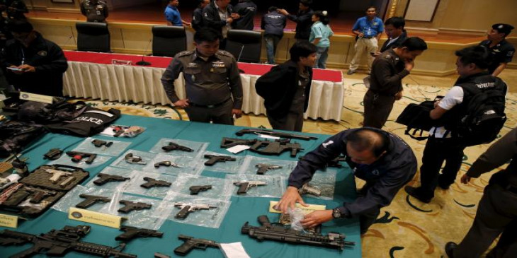 ထုိင္းရဲတပ္ဖြဲ႔မွ ျပဳလုပ္သည့္ သတင္းစာရွင္းလင္းပြြဲတြင္ ဖမ္းဆီးရမိသည့္ လက္နက္မ်ား ျပသထားစဥ္။ (ဓာတ္ပုံ - ႐ိုက္တာ)