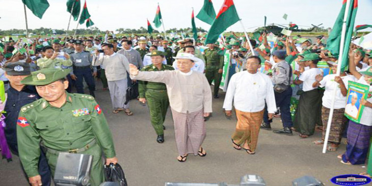 ႏို္င္ငံေတာ္သမၼတရဲ႕ ခရီးစဥ္ေတြကို ေဖာ္ျပေနတဲ့ ႏို္င္ငံပိုင္ သတင္းစာေတြမွာလည္း ႀကိဳဆိုသူေတြက ျပည္ခုိုင္ၿဖိဳး နဖူးစည္း၊ ဦးထုပ္၊ အက်ႌ၊ အလံေတြနဲ႔ လာေရာက္ၾကတာကို ဦးစားေပး ေဖာ္ျပေနၾကတာပါ။