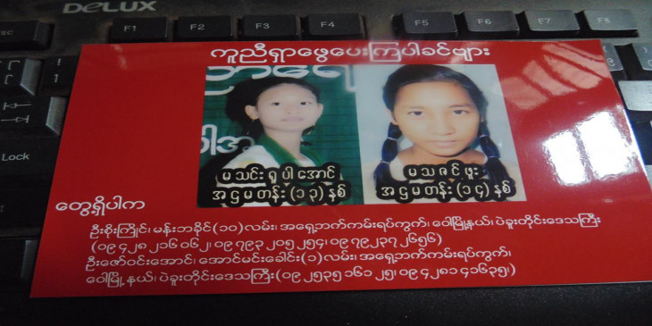 ေက်ာင္းသူ ၂ ဦး ေပ်ာက္ဆုံးေနမႈကုိ သက္ဆိုင္ရာ ေက်ာင္းအုပ္ဆရာနဲ႔ ေ၀ါၿမိဳ႕နယ္ ရဲစခန္းေတြကိုလည္း အမႈဖြင့္တိုင္ၾကားထားခဲ့ေပမယ့္ ျပန္မေတြ႔ရွိေသးတာေၾကာင့္ ဒီေန႔ ေန႔လယ္ပုိင္းမွာ ဗြီႏုိင္းပုိစတာေတြ ကုိင္ေဆာင္ၿပီး အကူညီေတာင္းခံေနၾကတာပါ။
