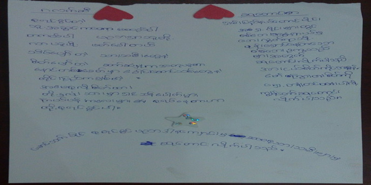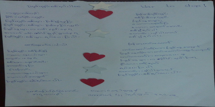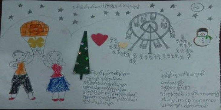 “စစ္ေဘးသင့္ကေလးေတြေပါ့၊ ပုန္းေရွာင္ေနရတဲ့ကေလးေတြ၊ ဒုကၡသည္စခန္းေရာက္ေနတဲ့ ကေလးေတြ၊ အဲလုိေၾကာက္လန္႔တၾကားနဲ႔ျဖစ္ေနတဲ့ စစ္ေဘးသင့္ကေလးေတြအတြက္ကုိ ဒီဘက္က လုံၿခံဳစိတ္ခ်ရတဲ့ေနရာမွာရွိေနတဲ့၊ ေအးခ်မ္းတဲ့ေနရာမွာ ရွိေနတဲ့ ကေလးေတြကေနၿပီးတာ့မွ သူတုိ႔ သူငယ္ခ်င္းေတြအတြက္ ပန္းခ်ီဆြဲၿပီး ပုိ႔လုိက္မယ္။ သူတုိ႔စားတဲ့အစားအစာေတြကုိ သူတုိ႔ ခြဲပုိ႔မယ္။ သူတုိ႔ ၀တ္တဲ့ အေႏြးထည္ေတြကုိ ခြဲပုိ႔မယ္။ သူတုိ႔စားတဲ့ေသာက္တဲ့၊ သူတုိ႔သုံးတဲ့ ပန္းကန္ျပားေတြခြဲပုိ႔မယ္။ အဲလုိ ကေလးကေလးခ်င္းေပါ့။ ပုိ႔လုိက္တဲ့ေနရာမွာလည္း စာေလးေတြေရးေပးမယ္။ ကုိယ္ကေတာ့ ဘယ္သူပါ၊ ဘယ္ႏွတန္းပါ၊ ဘယ္မွာေနပါတယ္ေပါ့။ သူငယ္ခ်င္းအတြက္ကုိ ဘာေလးပုိ႔လုိက္ပါတယ္ေပါ့။ တေန႔ေန႔မွာ ဒုိ႔ေတြ ျပန္ဆုံၾကမယ္ေပါ့။ ကေလးခ်င္းအားေပးတဲ့ပြဲပါ။”
