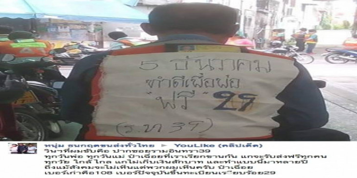 ထုိင္းဘုရင္ႀကီးရဲ႕ ၈၈ ႏွစ္ေျမာက္ ေမြးေန႔မွာ အသက္ ၅၃ ႏွစ္အရြယ္ ဆိုင္ကယ္တကၠစီ ေမာင္းေနတဲ့ ထုိင္းႏုိင္ငံသား တဦးဟာ ဆိုင္ကယ္ကုိ အခမဲ့ စီးခြင့္ျပဳခဲ့ၿပီး ကုသိုလ္ယူခဲ့ပါတယ္။