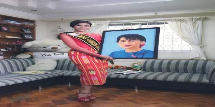 “Miss Tourism Queen Of The Year International 2015 မေလးရွားမွာ ျပဳလုပ္မယ့္ၿပိဳင္ပြဲမွာ charity ေလလံအတြက္ သမီးဂုဏ္ယူေလးစားျမတ္ႏိုးရပါတဲ့ 'အေမစု' ပံုတူပန္းခ်ီကားကို ယူသြားပါတယ္ရွင္။”