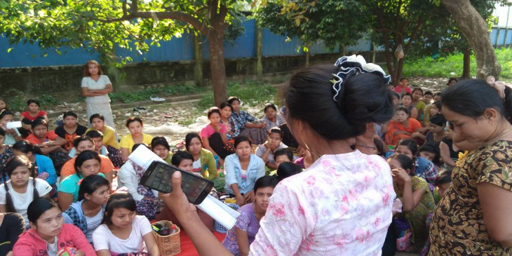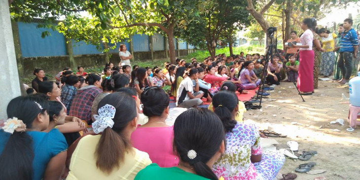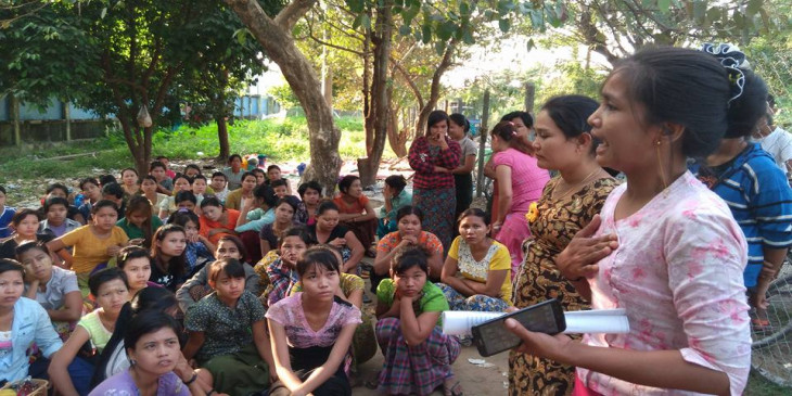 ရန္ကုန္တုိင္း လႈိင္သာယာၿမိဳ႕နယ္ စက္မႈဇုန္ ၄ မွာရွိတဲ့ "ထိပ္တန္းျမန္မာ" အထည္ခ်ဳပ္စက္ရုံ အလုပ္သမား ၂၀၀ ေက်ာ္ဟာ ၿပီးခဲ့တဲ့ ႏုိဝင္ဘာလအတြက္ လုပ္ခလစာ အျပည့္အဝ မရတာေၾကာင့္ ဒီဇင္ဘာလ ၇ ရက္ေန႔ ကတည္းက စက္ရုံေရွ႕မွာ ဆႏၵျပေနၾကပါတယ္။