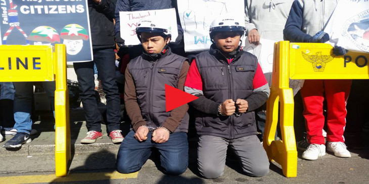 ထုိင္းသံ႐ုံးေရွ႕ သံၿပိဳင္ဟစ္ေႂကြး ဆႏၵျပခဲ့ၾကသည့္ ကုိရီးယားေရာက္ျမန္မာမ်ား (႐ုပ္သံ)