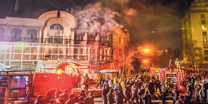 ထင္ရွားတဲ့ ရွီးယားမြတ္စလင္ အီရန္ ထိပ္တန္းေခါင္းေဆာင္ နင္မယ္လ္နင္မ္ကို ေဆာ္ဒီအစိုးရက ေသဒဏ္ေပးလိုက္တာကို မေက်နပ္လို႔ ဆႏၵျပသူေတြဟာ သံရံုးဂိတ္တံခါးေတြမွာ စုရံုးခဲ့ၾကၿပီးေနာက္ အေဆာက္အဦထဲကို ခ်ိဳးဖ်က္၀င္ေရာက္ကာ ပရိေဘာဂေတြကို ရိုက္ခ်ိဳးၿပီး မီး႐ႈိ႕ခဲ့ၾကပါတယ္။ ေနာက္မွ ရဲ ေရာက္လာၿပီး ႏွင္ထုတ္ခဲ့ပါတယ္။