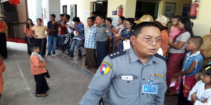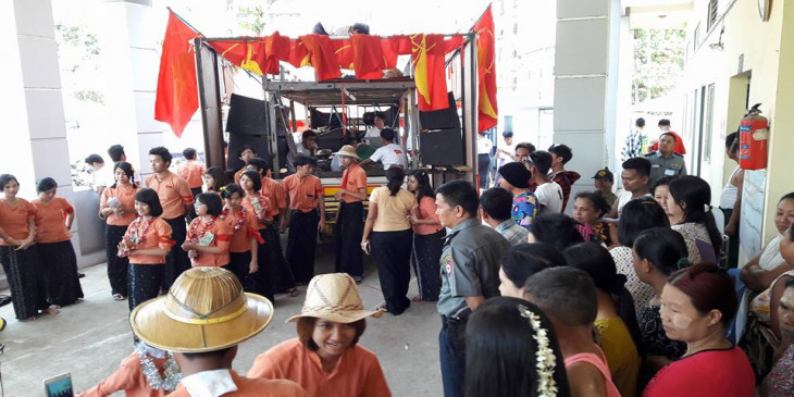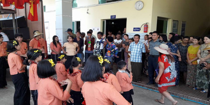 မဂၤလာေတာင္ညြန္႔ၿမိဳ႕နယ္ ရဲတပ္ဖြဲ႔စခန္းအတြင္း ဖိတ္ၾကားခ်က္အရ တကသ ေက်ာင္းသား/သူေတြရဲ႕ ေဒါင္းတို႔မ်ိဳးဆက္ သံခ်ပ္အဖြဲ႔ေဖ်ာ္ေျဖေနမႈ ျမင္ကြင္း။