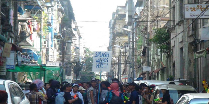 လူေတြ ရာနဲ႔ခ်ီၿပီး ေရျပြတ္ေတြနဲ႔ လမ္းေလွ်ာက္ေရကစားၾကတာကို သၾကၤန္ အတက္ေန႔ ညေနပိုင္းက ရန္ကုန္မွာ ျပဳလုပ္ခဲ႔ပါတယ္။