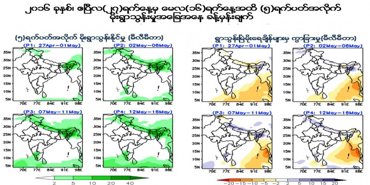 ဧၿပီ ၂၇ ရက္ကေန ေမလလယ္အထိ ကခ်င္ျပည္နယ္၊ ရွမ္းျပည္နယ္နဲ႔ စစ္ကိုင္းတိုင္းေဒသႀကီး (အထက္ပိုင္း)တို႔မွာ မိုးထစ္ခ်ဳန္း ရြာသြန္းႏိုင္ၿပီး ကခ်င္နဲ႔ စစ္ကိုင္းအထက္မွာ မိုးပိုႏိုင္တယ္လို႔ မိုးေလ၀သဌာနက သတင္းထုတ္ပါတယ္။