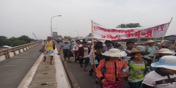 အလုပ္သမားေတြဟာ ဧၿပီ ၂၆ ရက္ကလည္း ေနျပည္ေတာ္ကုိ ကားနဲ႔သြားေရာက္ ဆႏၵျပဖို႔ ႀကဳိးပမ္းခဲ့ေပမယ့္ ၀မ္းတြင္းအေက်ာ္ မိတၳီလာအၾကားမွာ တားဆီးခံခဲ့ရလို႔ စစ္ကုိင္းကုိ ျပန္လာခဲ့ရၿပီး ဒီကေန႔ ေနျပည္ေတာ္ကို ထပ္မံလမ္းေလွ်ာက္သြားေရာက္ ဆႏၵျပဖုိ႔ ထြက္ခြာသြားၾကတာပါ။
