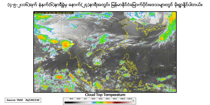 ဒီေန႔မနက္ပိုင္းတိုင္းတာခ်က္အရ အားေကာင္းတဲ့မိုးတိမ္ေတာင္ႀကီးတခုဟာ ခ်င္းျပည္နယ္ အတြင္းကေန ျမန္မာျပည္ထဲ ျဖတ္သန္း၀င္ေရာက္ေနၿပီး အဲ့ဒီတိမ္ေတာင္ေၾကာင့္ ဒီေန႔ မနက္ပိုင္း ကစလို႔ ေနာက္ ၂၄ နာရီအတြင္း ခ်င္းျပည္နယ္၊ စစ္ကိုင္းတိုင္း၊ ကခ်င္ျပည္နယ္၊ မေကြြးတိုင္း ေျမာက္ပိုင္း၊ ရခိုင္ျပည္နယ္ေျမာက္ပိုင္းတို႕မွာ မိုးအသင့္အတင့္ ရြာသြန္းႏိႈင္ၿပီး ေခတၱခဏမွ် မိုးသည္းထန္ႏိႈင္တယ္လို႔ သတင္းထုတ္ပါတယ္။