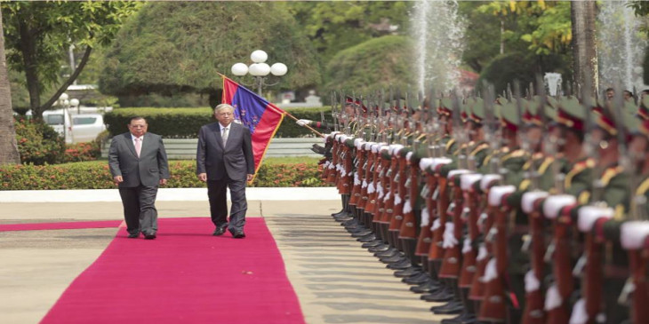 ျမန္မာသမၼတဦးထင္ေက်ာ္၊ ႏိုင္ငံေတာ္အတိုင္ပင္ခံ ေဒၚေအာင္ဆန္းစုၾကည္နဲ႔ အစိုးရအဖဲြ႔၀င္ေတြကို လာအိုသမၼတက ဒီေန႔ မနက္ပိုင္းမွာ ဂုဏ္ျပဳတပ္ဖြဲ႔နဲ႔ ႀကိဳဆိုခဲ့ပါတယ္။