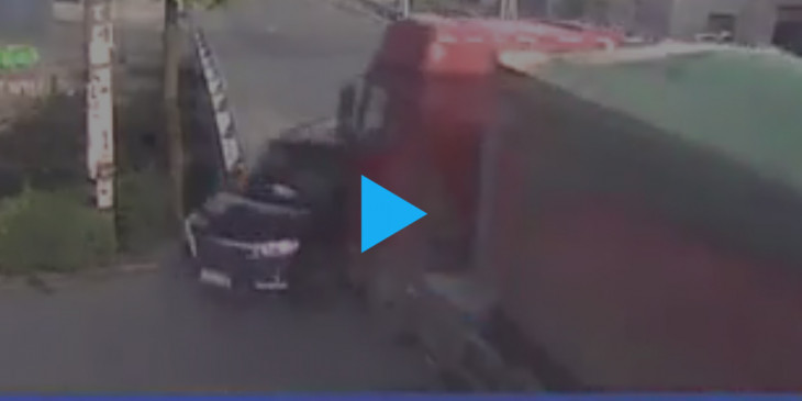 ေမ ၅ ရက္ေန႔က SUV ကားဟာ လမ္းဆုံကိုျဖတ္ကူးလာစဥ္ ထရပ္ကားက ၀င္တုိက္မိခဲ့လုိ႔ ေၾကမြသြားခဲ့တာကို လုံၿခဳံေရး ကင္မရာက မွတ္တမ္းတင္ထားပါတယ္။