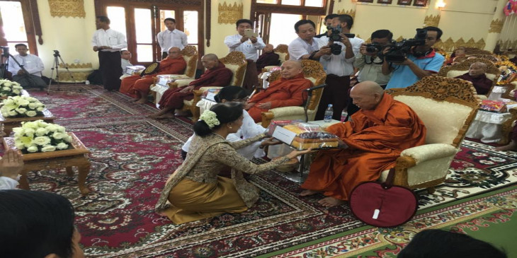ေဒၚေအာင္ဆန္းစုၾကည္က ရန္ကုန္ၿမိဳ႕ ကမာၻေအး ကုန္းေျမမွာ ႏိုင္ငံေတာ္ သံဃာ့နာယက ဆရာေတာ္ေတြရဲ႕ ၾသဝါဒကိုခံယူခဲ့ၿပီး၊ လက္ရွိ အစိုးရရဲ႕ ေဆာင္ရြက္သြားမယ့္ သေဘာထားေတြကို ထဲ့သြင္း ေလ်ွာက္တင္ခဲ့တာ ျဖစ္ပါတယ္။