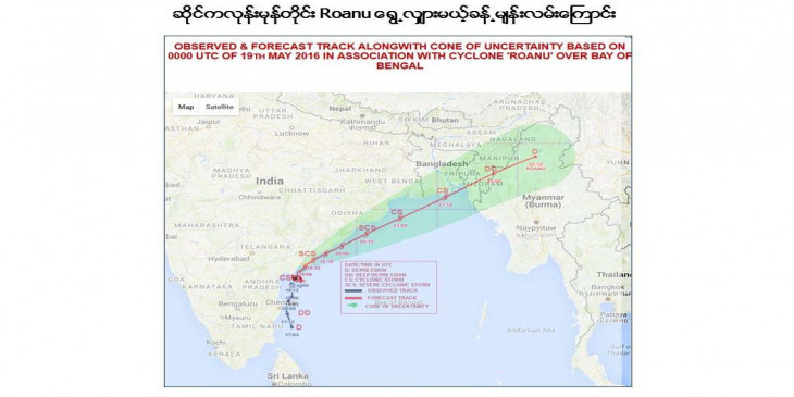 “ဆိုင္ကလုန္း ရြန္ႏူဟာ အေရွေျမာက္ဘက္ကို တနာရီ ၁၀ မိုင္ႏႈန္းနဲ႔ ေရြ႕ေနပါတယ္။ ပထမတုန္းက ခန္႔မွန္းထားတာက ေနာက္ ၆ နာရီအတြင္းမွာ အားေကာင္းလာမယ္ဆိုၿပီးေတာ့ ခန္႔မွန္းထားပါတယ္။ မေန႔ညတုန္းကေတာ့ အင္ဒါပရာေဒ့ရွ္ကမ္းေျခမွာ ေရြ႔လ်ားမႈမရွိဘဲ ေမႊလိုက္တဲ့အတြက္ေၾကာင့္ ဒီေန႔ ညပိုင္းေလာက္မွ အားေကာင္းတဲ့ ဆိုင္ကလုန္းမုန္တိုင္း အဆင့္ကို ေရာက္ႏိုင္မယ့္ အေနအထား ရွိပါတယ္။ ဆိုင္ကလုန္းမုန္တိုင္းဟာ ဘဂၤလားေဒ့ရွ္ႏိုင္ငံ ေတာင္ပိုင္းကမ္းေျခကို ဦးတည္ေနတယ္။ ဒါေပမယ့္ ဆိုင္ကလုန္းရဲ႕ အ၀န္းအ၀ိုင္းထဲမွာေတာ့ ျမန္မာဘက္က ခ်င္းျပည္နယ္၊ ရခိုင္ျပည္နယ္တို႔ ပါ၀င္ေနတဲ့အတြက္ မုန္တိုင္းကို လိေမၼာ္ေရာင္ အဆင့္ သတ္မွတ္ထားတယ္။”
