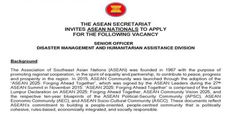 အာဆီယံအတြင္းေရးမႉး႐ုံး အႀကီးတန္းအရာရွိေနရာမ်ား လစ္လပ္သျဖင့္ ေလွ်ာက္ထားႏိုင္