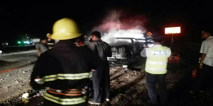 ရန္ကုန္-မႏၱေလး အျမန္လမ္းတြင္ ယာဥ္ ၂ စီးတိုက္ၿပီး မီးေလာင္ကၽြမ္း၊ ၁ ဦးေသဆံုး