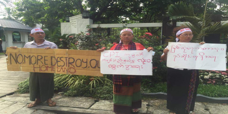 ဆႏၵျပသူေတြဟာ စီမံကိန္းအေကာင္ထည္ေဖာ္ေနတဲ့ CPI ကုမၸဏီ ကခ်င္ျပည္နယ္မွ လုံး၀ထြက္ခြာေရး၊ ျမစ္ဆုံေရကာတာ လုံး၀ရပ္ဆုိင္းေရး စတဲ့ ပုိစတာေတြ ကုိင္ေဆာင္ဆႏၵျပခဲ့ၾကပါတယ္။