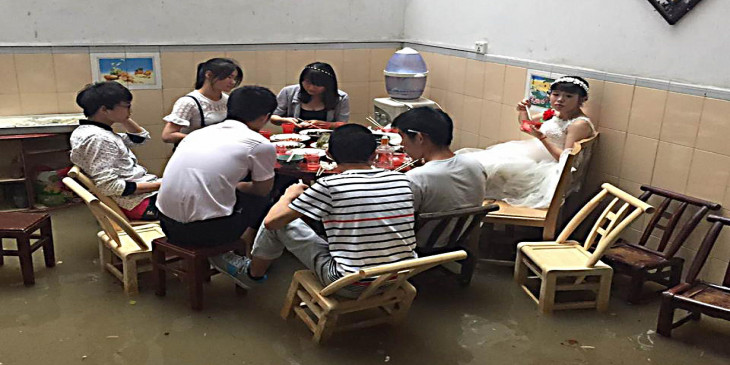 တ႐ုတ္ႏိုင္ငံအႏွံ႔ ၿပီးခဲ့တဲ့ ရက္ေတြတုန္းက မိုးသည္းသည္းထန္ထန္ ရြာသြန္းခဲ့လို႔ ေရႀကီးေရလွ်ံမႈေတြ ျဖစ္ေပၚခဲ့ေပမယ့္ စံုတြဲတတြဲကေတာ့ သူတို႔ရဲ႕ မဂၤလာပြဲကို မိုးထဲေရထဲမွာပဲ က်င္းပခဲ့ၾကပါတယ္။