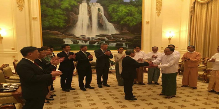 စင္ကာပူ၀န္ႀကီးခ်ဳပ္နဲ႔ အဖြဲ႔ကို ေနျပည္ေတာ္မွာ သမၼတ ဦးထင္ေက်ာ္က ဂုုဏ္ျပဳတပ္ဖြဲ႔နဲ႔ ႀကိဳဆိုုခဲ့ၿပီး သမၼတအိမ္ေတာ္မွာပဲ ေတြ႔ဆုံေဆြးေႏြးပါတယ္။