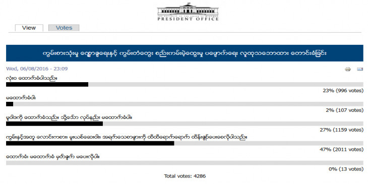 ႏိုင္ငံေတာ္သမၼတ႐ုံးက သေဘာထားစစ္တမ္းေကာက္ယူခ်က္ကို တုံ႔ျပန္ၾကတဲ့ ျပည္သူေတြက သေဘာထား ေဖာ္ျပခဲ့တာျဖစ္ပါတယ္။
