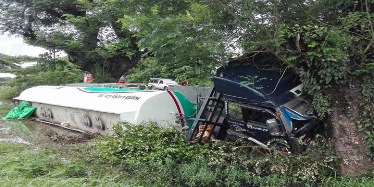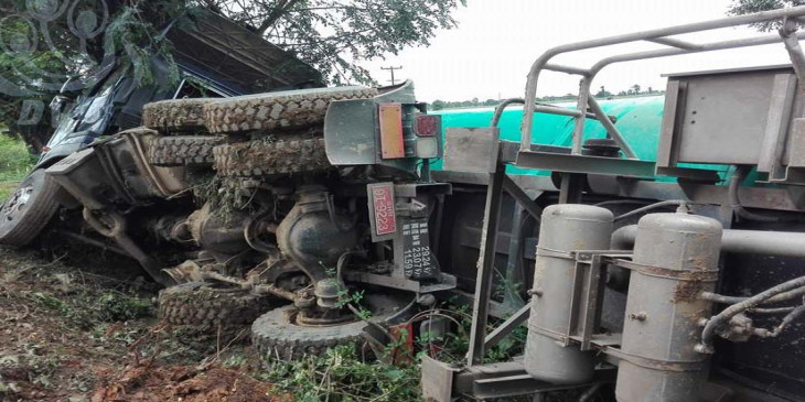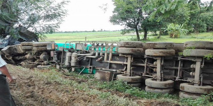 ဇူလိုင္ ၄ ရက္ေန႔ မနက္ ၅ နာရီေလာက္က ရန္ကုန္ဘက္ကေန မႏၲေလးဘက္သို႔ ေမာင္းႏွင္လာတဲ့ နစ္ဆန္း ဒီဇယ္လ္(NISSAN DIESEL) အမ်ိဳးအစား ၂၂ ဘီး ဆီသယ္ေဘာက္ဆာကားဟာ ရန္ကုန္-မႏၲေလးလမ္းေဟာင္းမိုင္တိုင္အမွတ္ ၁၂၈/၀ နဲ႔ ၁၂၈/၁ အၾကားမွာ အခ်ိန္မထိန္းနိုင္ျဖစ္ကာ လမ္းေဘးသစ္ပင္ကို တိုက္မိၿပီး တိမ္းေမွာက္ခဲ့ပါတယ္။