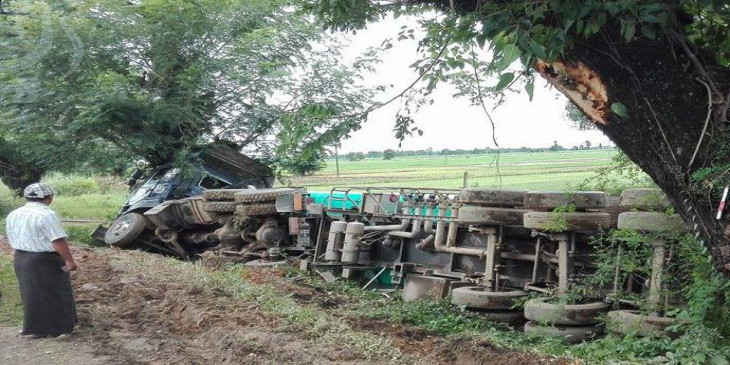ပဲခူးတိုင္ေဒသႀကီး ေက်ာက္တံခါးၿမိဳ႕နယ္ ေတာကၽြဲအင္းၿမိဳ႕ ေျမာက္ဘက္ ၃ ဖာလံုအကြာ ရန္ကုန္-မႏၲေလးလမ္းေဟာင္းမိုင္တိုင္အမွတ္ ၁၂၈/၀ နဲ႔ ၁၂၈/၁ အၾကားမွာ ၂၂ ဘီး ဆီသယ္ ေဘာက္ဆာယာဥ္ဟာ လမ္းေဘးသစ္ပင္ကို တိုက္ၿပီး တိမ္းေမွာက္ခဲ့ပါတယ္။