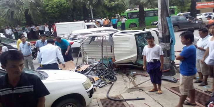 ေတာင္ဥကၠလာၿမိဳ႕နယ္ ေဝဇယႏၱာလမ္း City Mart ေရွ႕မွာ ဇူလိုင္လ ၅ ရက္ေန႔ မနက္ ၁၀ နာရီေလာက္က Air Con ကုမၸဏီတခုက မီနီထရပ္လုပ္ငန္းသံုးကား အရွိန္လြန္ၿပီး လမ္းေဘးမွာ ရပ္ထားတဲ့ အငွားယာဥ္ကို တိုက္မိကာ တိမ္းေမွာက္ခဲ့ပါတယ္။