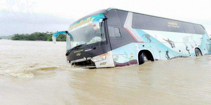 ရခုိင္ျပည္နယ္အတြင္းေရႀကီးမႈေၾကာင့္ ေျမာက္ဦးၿမိဳ႕ကေန အမ္းၿမိဳ႕ဆီ သြားတဲ့ကားေတြ ၁၀ စီး ေရွ႕ဆက္သြားလုိ႔မရသလုိ ေနာက္ျပန္လွည့္လုိ႔မရတဲ့အတြက္ အမ္းၿမိဳ႕နယ္အတြင္းက ကဇုကုိင္း ေခ်ာင္းနီးမွာ ပိတ္မိေနပါတယ္။