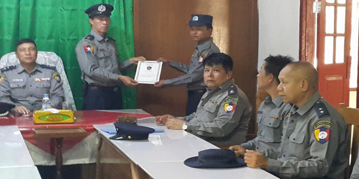 မတ္လ ၃ ရက္ေန႔က ကေလးၿမိဳ႕ ေအာင္ေျမမာန္ရပ္ကြက္ ဗိုလ္ခ်ဳပ္လမ္းေပၚက ေရႊဝါလင္း ေရႊဆိုင္ကို ဝင္ေရာက္ ဓားျပတိုက္ခဲ့တဲ့ တရားခံကို ၁ နာရီေက်ာ္အတြင္း ေရႊ ၁၂ က်ပ္သားေက်ာ္နဲ႔ အတူ ဖမ္းဆီးႏိုင္ခဲ့တဲ့အတြက္ ကေလးခ႐ုိင္မႈခင္းႏွိမ္ႏွင္းေရးအဖြဲ႔က ရဲတပ္ဖြဲ႔ဝင္ ၃ ဦးကို ျမန္မာႏိုင္ငံရဲခ်ဳပ္ေဇာ္ဝင္းက ဒီေန႔ ေန႔လယ္မွာ ဂုဏ္ျပဳမွတ္တမ္းလက္မွတ္ေတြ ခ်ီးျမႇင့္ခဲ့ပါတယ္။