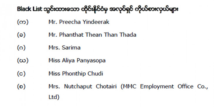 နာမည္ပ်က္ စာရင္းတင္သြင္းလိုက္တဲ့အထဲမွာ ထိုင္းႏိုင္ငံကကုမၸဏီေပါင္း ၂၄ ခု နဲ႔ လူပုဂၢိဳလ္ ၆ ဦး ပါ၀င္ၿပီး အဆိုပါစာရင္းေတြကို သက္ဆိုင္ရာ ေအဂ်င္စီေတြအားလံုးရဲ႕အဖြဲ႕ခ်ဳပ္၊ ထိုင္းႏိုင္ငံကို အလုပ္သမားေစလႊတ္ေနတဲ့ ေအဂ်င္စီေတြ ၊ အလုပ္ေခၚစာေတြကို ေထာက္ခံေပးေနတဲ့ ထိုင္းႏိုင္ငံက အလုပ္သမား သံအရာရွိေတြဆီကို ဇူလိုင္ ၁၈ ရက္ေန႔က ေပးပို႔ထားပါတယ္။