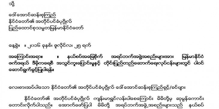 ျမန္မာႏိုင္ငံ ဖက္ဒရယ္ဒီမိုကေရစီ အသြင္ကူးေျပာင္းမႈနဲ႔ တိုင္းျပည္တည္ေဆာက္ေရး လုပ္ငန္းေတြမွာ ပါဝင္ေဆာင္ရြက္ခြင့္ျပဳဖုိ႔ နယ္စပ္အေျခစိုက္ အရပ္ဘက္အဖဲြ႔အစည္း ၄၀ က ႏုိင္ငံေတာ္အတိုင္ပင္ခံပုဂၢိဳလ္ ေဒၚေအာင္ဆန္းစုၾကည္ထံ အိတ္ဖြင့္ေပးစာ ေပးပုိ႔ ေတာင္းဆိုလိုက္ပါတယ္။