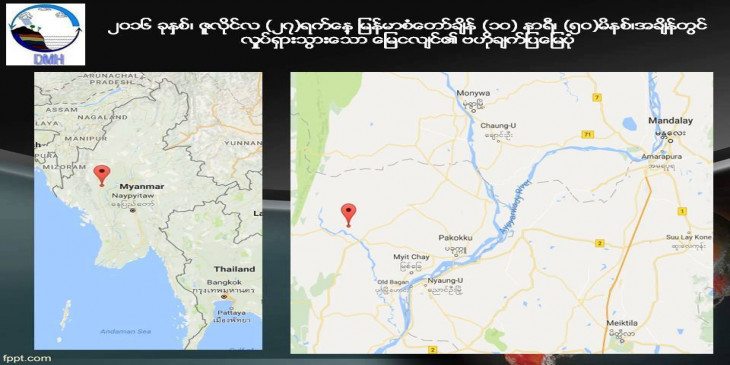 မနၱေလးေျမငလ်င္စခန္းမွ အေနာက္ေတာင္ဘက္မိုင္ ၁၁၀ ခန္႔ ကြာေ၀းေသာ ျမန္မာနိုင္ငံျပည္တြင္း (ပခုကၠဴၿမိဳ႕၏ အေနာက္ေျမာက္ဘက္ ၃၈ မိုင္ခန္႔အကြာ)ကို ဗဟိုျပဳ၍ အင္အား ရစ္(ခ္)တာစေကး ၄.၉ အဆင့္ရိွ အင္အားအနည္းငယ္ရွိေသာ ေျမငလ်င္တခု လႈပ္ရွားသြားေၾကာင္း ေဖာ္ျပထားပါတယ္။