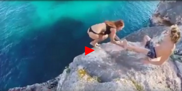 ေက်ာက္ကမ္းပါး အျမင့္ေပၚကေန ေရထဲကို ခုန္ခ်ဖို႔ အတြက္ ဘီကနီ၀တ္ထားတဲ့ ေကာင္မေလးက ျပင္ဆင္ေနပါတယ္။