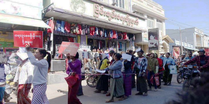 မံုရြာၿမိဳ႕မွာ စတုိးဆိုင္ပိုင္ရွင္နဲ႔ ဆိုင္ဝန္ထမ္းေဟာင္းေတြရဲ႕အမႈကို တရားရံုးရဲ႕ ဆံုးျဖတ္ခ်က္အေပၚေက်နပ္မႈမရွိလို႔ ဆိုင္ဝန္ထမ္းေဟာင္းေတြနဲ႔ မိသားစုဝင္ေတြက ဒီကေန႔ ၿမဳိကတြင္း စီတန္းလွည့္လည္ ဆႏၵျပခဲ့ၾကပါတယ္။