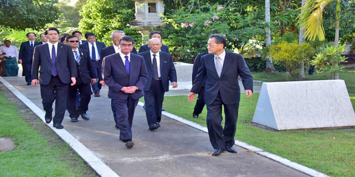 ျမန္မာႏိုင္ငံမွာ ခ်စ္ၾကည္ေရးခရီး ေရာက္ရွိေနတဲ့ ဂ်ပန္ႏိုင္ငံ ႏိုင္ငံျခားေရးဝန္ႀကီး တာ႐ိုကိုႏိုဟာ ရန္ကုန္ၿမိဳ႕ ေျမာက္ဥကၠလာပၿမိဳ႕နယ္၊ ေရေ၀းသုသာန္ဝင္းရွိ ဂ်ပန္စစ္သခ်ဳႋင္းကို သြားေရာက္ ေလ႔လာခဲ့ပါတယ္။
