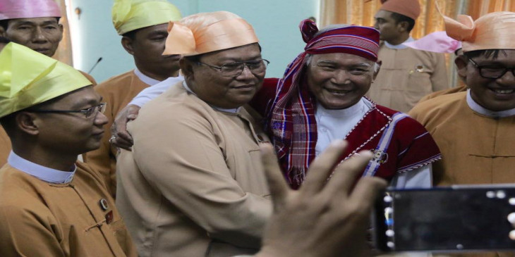 ဧရာဝတီတိုင္းေဒသႀကီး ဝန္ႀကီးခ်ဳပ္အျဖစ္ တာဝန္ေပးအပ္ခံရတဲ့ ဦးလွမိုးေအာင္နဲ႔ ၀န္ႀကီးခ်ဳပ္ေဟာင္း မန္းေဂ်ာ္နီတုိ႔ကုိ ပုသိမ္ၿမိဳ႕ ဧရာ၀တီတုိင္းေဒသႀကီး လႊတ္ေတာ္အတြင္း ေတြ႔ရစဥ္။