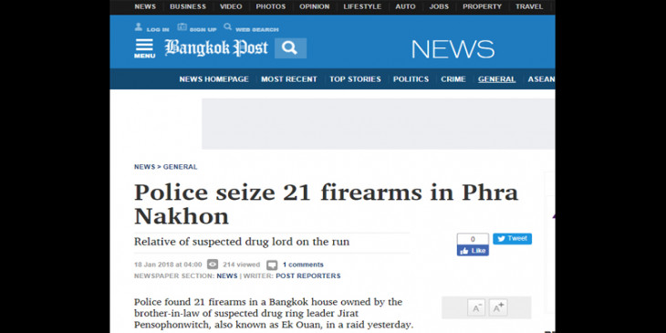 မူးယစ္ေဆးဝါး ကြင္းဆက္ေခါင္းေဆာင္ သံသယရွိသူ ဂ်ီရက္ပန္စုိဖြန္ဝွစ္ခ်္ ေခၚ အိ့က္အုိဝန္ရဲ႕ ေယာက္ဖပုိင္ ဘန္ေကာက္အိမ္မွာ ဇန္နဝါရီ ၁၇ ရက္ေန႔က ေရွာင္တခင္ စစ္ေဆးမႈအတြင္း ရဲေတြက ေသနတ္ ၂၁ လက္ ေတြ႔ခဲ့တယ္လုိ႔ သိရပါတယ္။