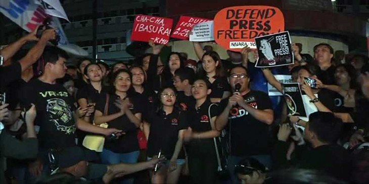 ဖိလစ္ပိုင္ သတင္းဝက္ဘ္ဆိုက္တစ္ခုကို အစိုးရက အေျခခံဥပေဒတားျမစ္ခ်က္ ခ်ိဳးေဖာက္တယ္ဆိုၿပီး လိုင္စင္ပိတ္သိမ္းလိုက္တာကို ဆန္႔က်င္တဲ့ ဂာ်နယ္လစ္ ၂၀၀ ေလာက္ဟာ ၿမိဳ႕ေတာ္ မနီလာမွာ စုေဝးဆႏၵျပခဲ့ၾကပါတယ္။