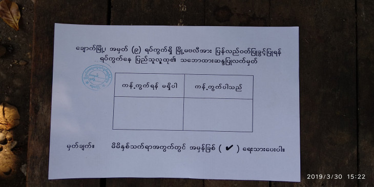 အဆိုပါ ရပ္ကြက္ ၂ ခုမွာ ဆႏၵမဲေပးနိုင္သူ ၇၀၀ ေက်ာ္ရွိၿပီး အိမ္ေထာင္စု တစုက အိမ္ေထာင္ဦးစီး သို႔မဟုတ္ အသက္ ၁၈ နွစ္ျပည့္ၿပီး သူကိုယ္စားလွယ္က မဲဆႏၵ လွ်ဳိ႕ဝွက္စနစ္နဲ႔ ေပးခြင့္ရိွတယ္လိုသိရပါတယ္။