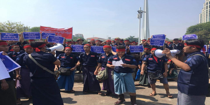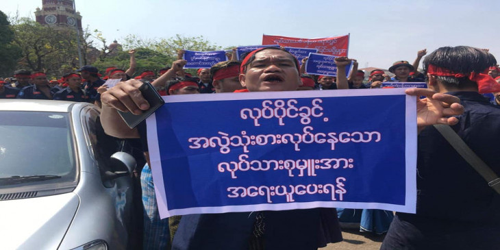 ရန္ကုန္ ၾကည့္ျမင္တိုင္ၿမဳိ႕နယ္ရွိ၊ စံျပငါးေစ်းမွာလုပ္ေဆာင္ေနတဲ့ ခိုးဆိုးလုႏိႈက္ ပေပ်ာက္ေရး၊ တရားမဝင္လုပ္သားေလ်ာ့နည္းေရး စီမံခ်က္နဲ႔ပတ္သတ္ၿပီး တရားဝင္ ငါးေတာင္း ထမ္းတဲ့ လုပ္သားေတြက ဧၿပီ ၁ ရက္က ရန္ကုန္ၿမိဳ႕ေတာ္ခန္းမေရွ႕မွာ ဆႏၵေဖာ္ျပခဲ့ၾကပါတယ္။