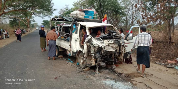 မေကြးတိုင္းေဒသႀကီး၊ ပခုကၠဴခ႐ုိင္၊ ၿမိဳင္ၿမိဳ႕နယ္ ပုသိမ္-မုံ႐ြာလမ္းမမွာ ဒီေန႔ မနက္ပိုင္းက ဆီေဘာင္ဆာယာဥ္နဲ႔ လိုက္ထရပ္ယာဥ္တို႔ တိုက္မိတဲ့အတြက္ ခရီးသည္ ၈ ဦး ေသဆံုးခဲ့ၿပီး ၁၄ ဦး ဒဏ္ရာရရွိခဲ့ပါတယ္။